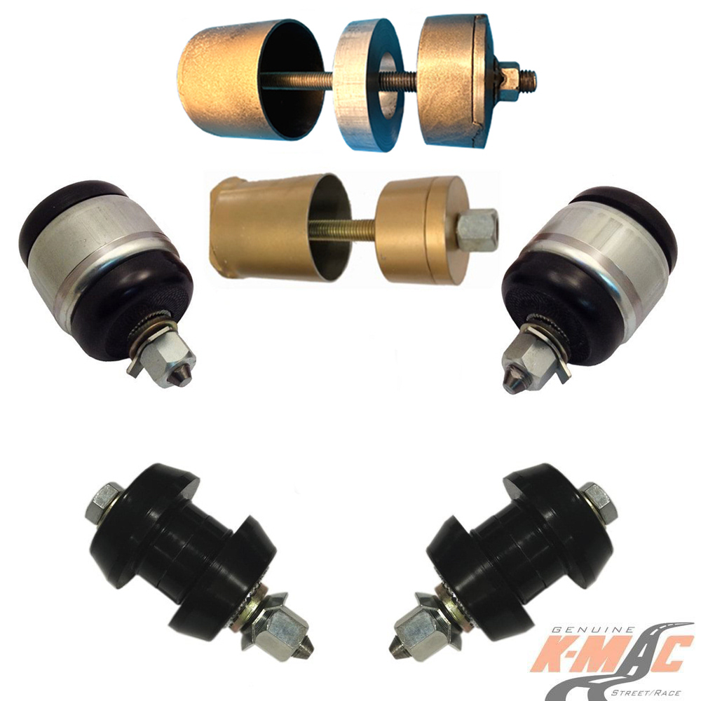 FRONT CAMBER & CASTER LOWER ARM INNER BUSHINGS (with K-MAC retaining the original OEM Hi-Strength forged alloy arms). Can be fitted without need for arm removal (or Special Tools). Unique K-MAC patented design breakthrough allows “precise single wrench” adjustment – on car without disassembly each time. Caster bushes are Monoball / 2 Axis significantly improving Brake and Steering response and with fail safe lock system.